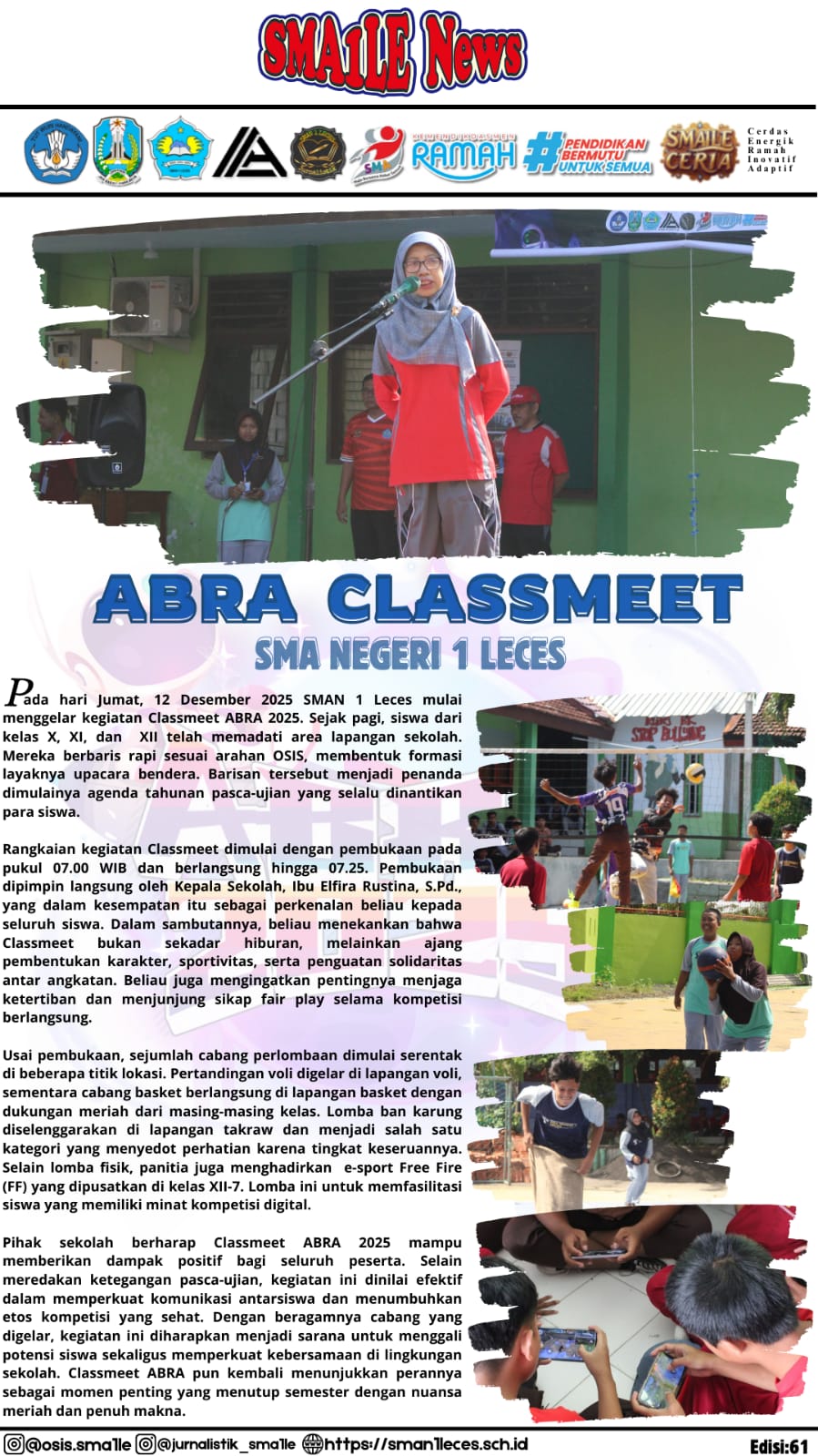 Pada pagi hari ini 18 Desember 2025, SMA Negeri 1 Leces menggelar kegiatan penutupan class meeting ABRA 2025 yang bertempat di lapangan sekolah. Kegiatan dimulai sejak pukul 07.00 hingga 08.30 WIB, diikuti oleh seluruh siswa, guru, serta panitia pelaksana (OSIS). Sejak pagi, siswa berdatangan dengan mengenakan seragam olahraga dan segera berkumpul dengan tertib di lapangan […]